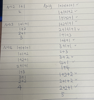 하지만 문제에서 1+2+2, 2+1+2, 2+2+1은 항상 같은 값으로 나오기 때문에 처음 나는 중복된 것을 뺐다. 그래서 파티션을 나눠서 공통점을 찾으려는 과정에서 어려움을 겪게 되고, 찾지 못하게 된다.