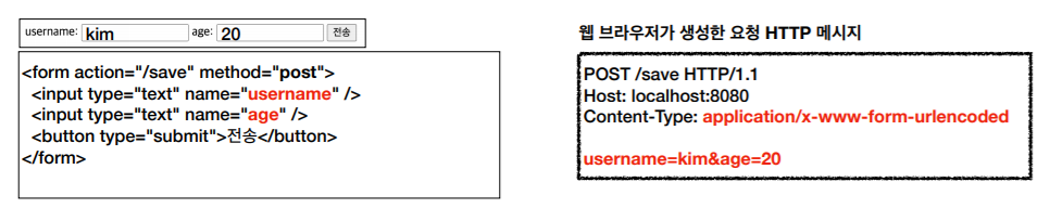 username과 age를 입력하여 전송을 누르면 HTTP 메시지 바디에 username과 age가 전달된다.