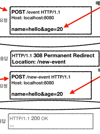 영구적인 리다이렉션과 다르게 다음에 URI가 또 어떻게 바뀔지 모르기 때문에 요청해주는 대로 나가야함.