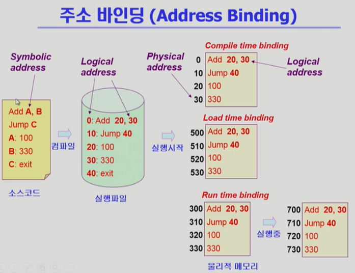 - loader의 책임하에 물리적 메모리 주소가 부여되며, 프로그램이 종료될 때까지 물리적 메모리 상의 위치가 고정