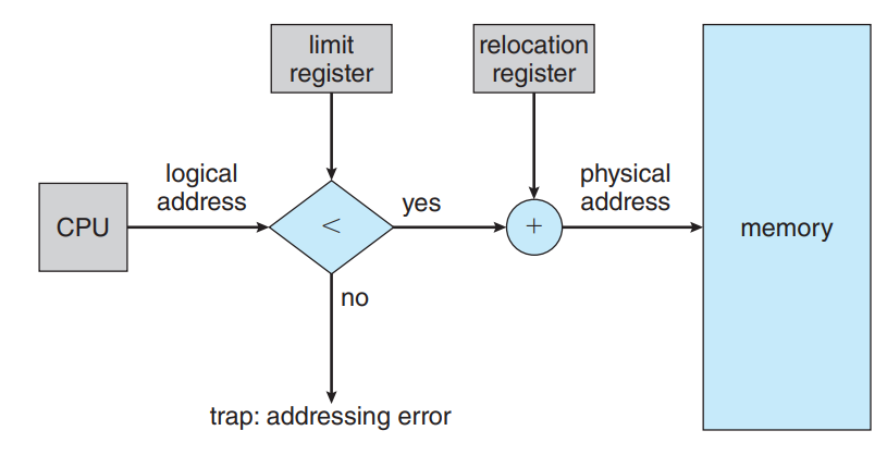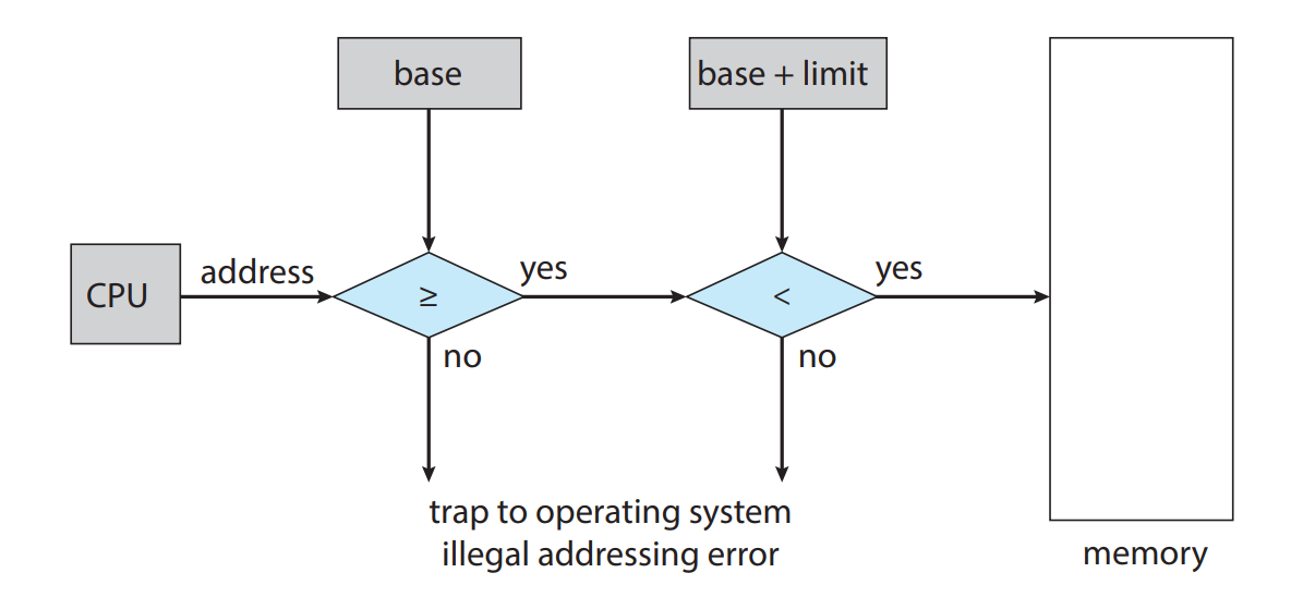 - base register를 이용하여 가장 작은 legal한 물리 메모리 주소 값 저장