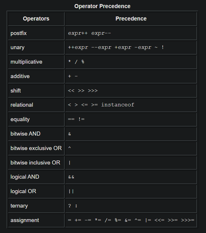 unary(단항) 연산자와 assignment 연산자는 <- 방향으로 진행, 나머지 연산들은 -> 방향으로 진행된다