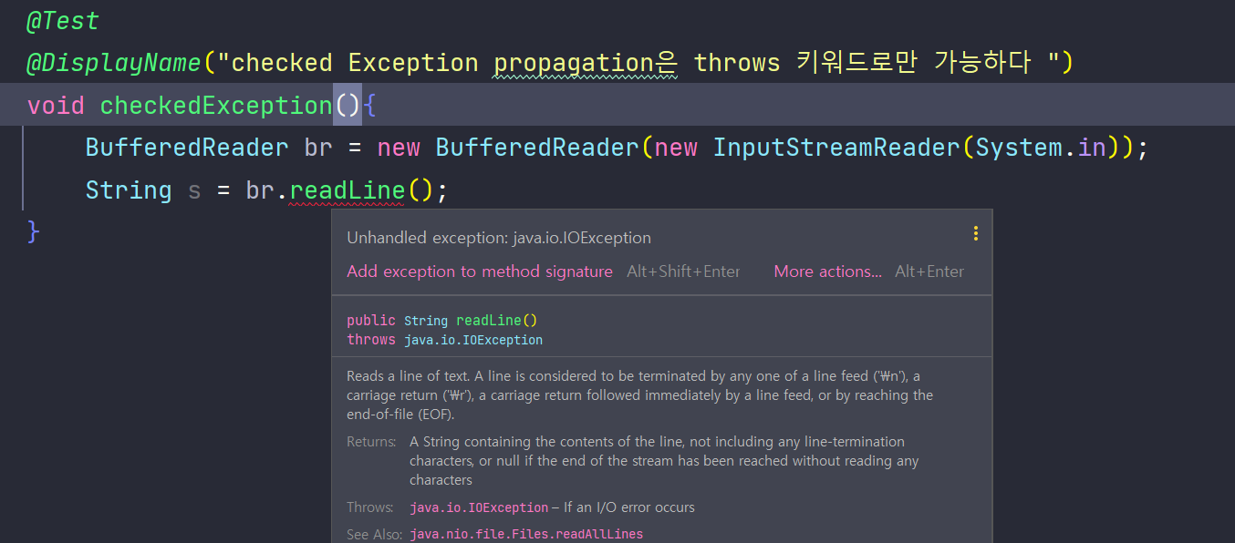 @DisplayName("checked Exception propagation은 throws 키워드로만 가능하다 ")