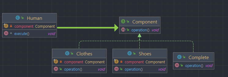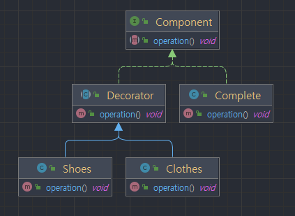 하지만 Shoes와 Clothes는 추가할 기능이고, 메인 비즈니스 로직은 Complete입니다. 그래서 Decorator와 Component를 구별하기 위해서 새로운 Decorator 클래스를 하나 생성하여 Shose와 Clothes를 상속하게 하면 됩니다.