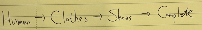 human이 execute를 하면 옷을 입고(clothes) → 신발을 신고(shoes) → 집을 나섭니다(complete)