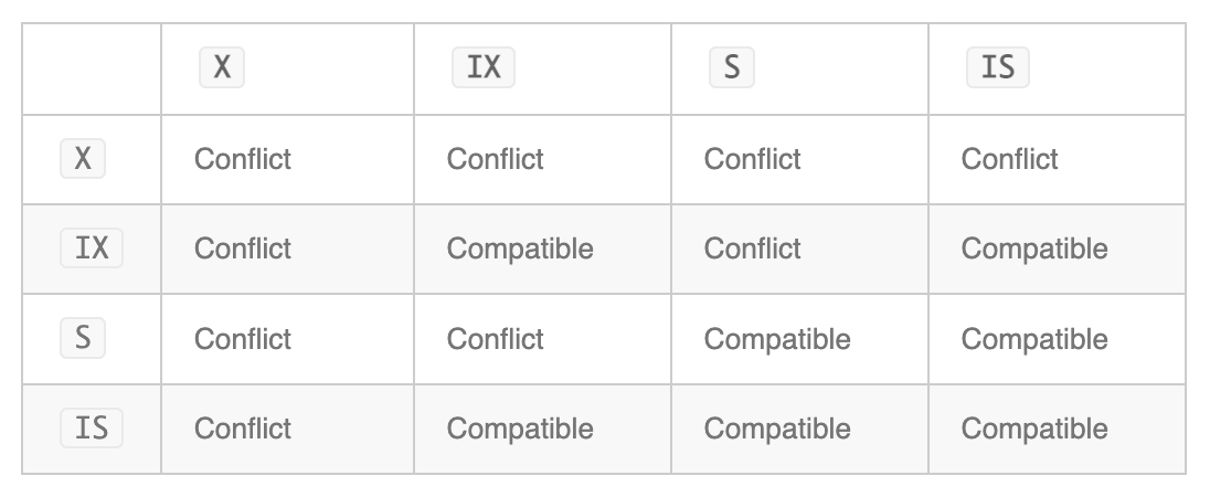 예를 들면 테이블 수준에서만 intent lock을 검사하여 트랜잭션이 해당 테이블에 대한 잠금을 안전하게 획득할 수 있는지 여부를 알 수 있습니다. 즉, 트랜잭션이 table lock을 얻기 위해 table의 모든 row lock을 확인할 필요가 없어집니다.