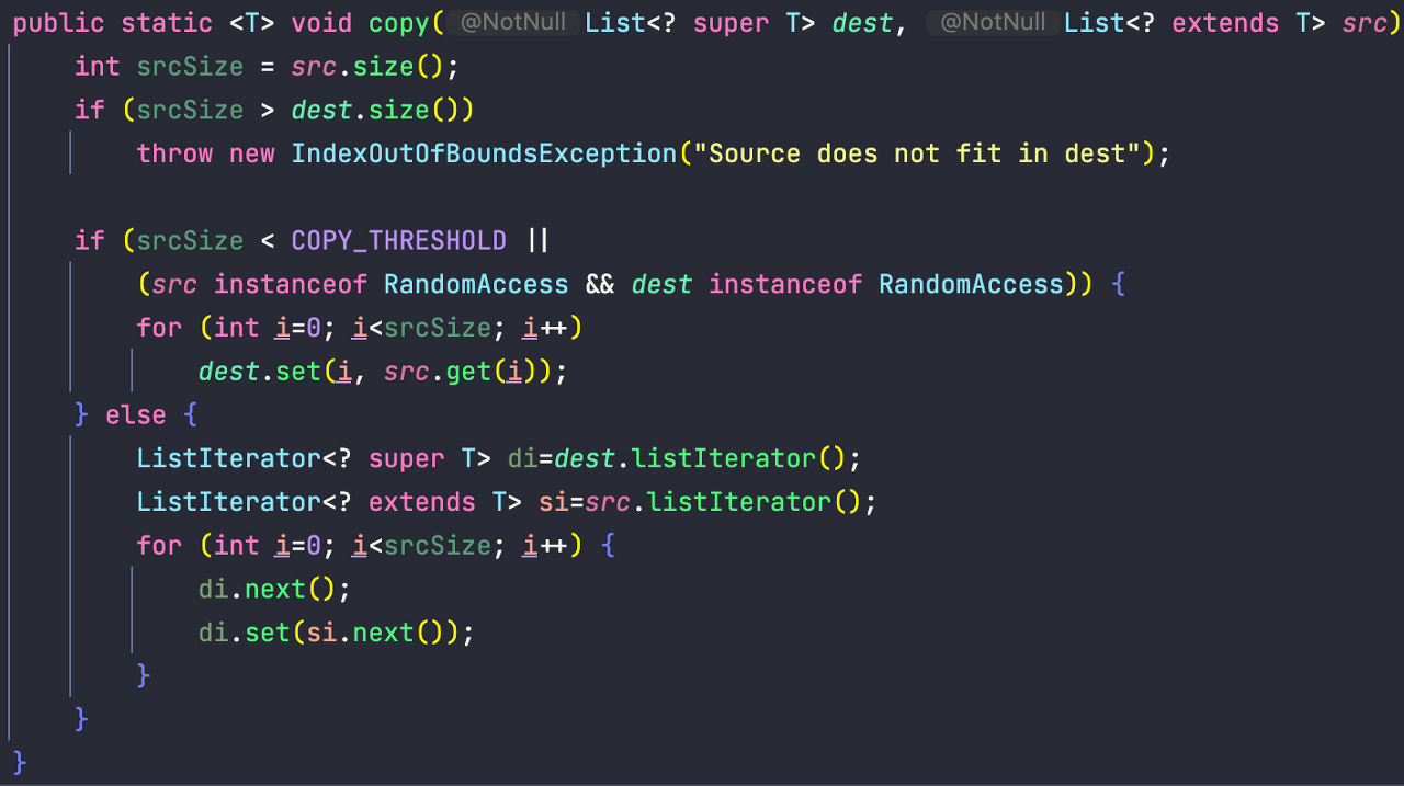 Collections 클래스의 copy 메서드를 보면 dest는 super, src는 extends로 제한하고 있습니다.