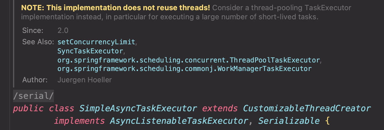 @Async를 사용한 방법에도 문제점이 있습니다. @Async의 기본 설정은 SimpleAsyncTaskExecutor로 thread를 재사용하지 않습니다.
