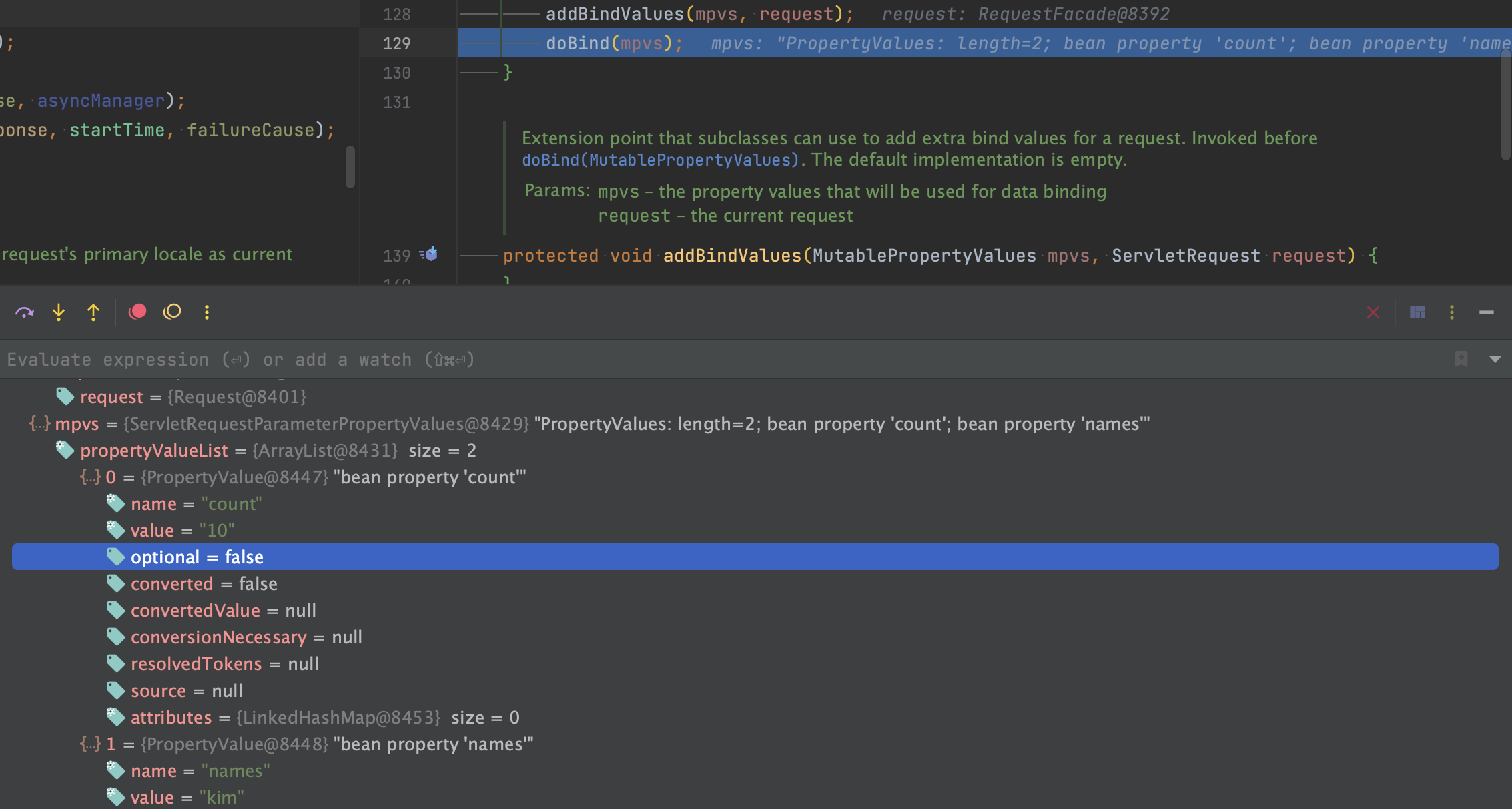코드를 보니 들어오는 값들은 PropertyValue에 저장되어 있고, 이를 객체에 바인딩해줍니다.