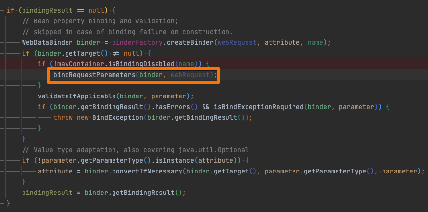 bindRequestParameters는 ModelAttributeMethodProcessor에 구현되어 있는 메서드이지만, 지금은 ModelAttributeMethodProcessor 를 상속받고 있는 ServletModelAttributeMethodProcessor 가 오버라이딩 한 메서드를 호출합니다.