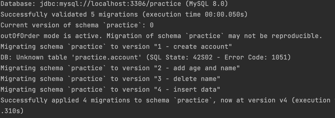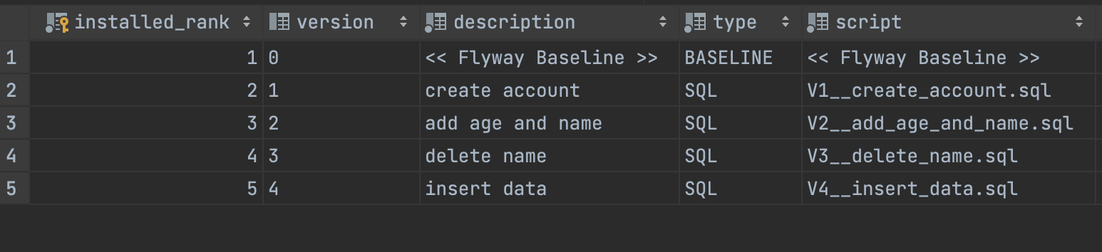 intellij로 애플리케이션 실행하게 되면 baseline-version 이 제대로 실행되지 않는 것을 알 수 있습니다. 즉, script version v1부터 순차대로 읽습니다.