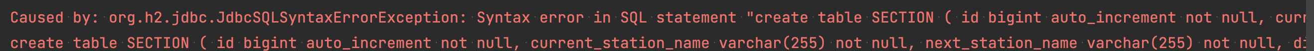 하지만 schema.sql을 읽는 중에 H2 데이터베이스에 올바르지 않은 스키마라며 계속해서 테스트가 진행되지 않았습니다.