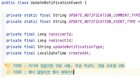 위에서 NotificationEvent가 가지고 있는 인스턴스 필드는 모든 알림에서 공통으로 가지고 있기 때문에,