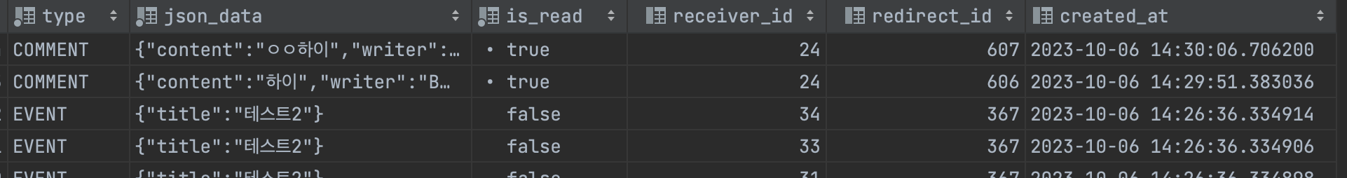 커디에서는 현재 댓글 알림, 행사 알림이 하나의 테이블에서 관리되고 있습니다.